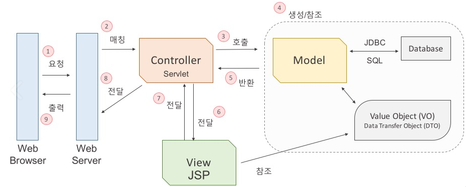 - 사용자로부터 View에 요청이 있으면 Controller는 해당 업무를 수행하는 Model을 호출하고 Model이 업무를 모두 수행하면 다시 결과를 View에 전달하는 역할을 합니다.