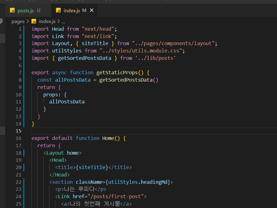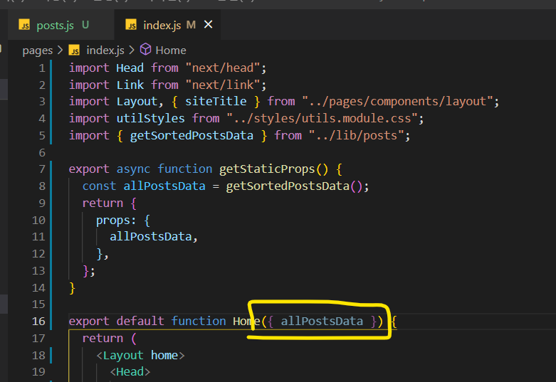3️⃣ getSortedPostsData에 대한 import를 추가하고 pages/index.js의 getStaticProps 내에서 호출합니다.