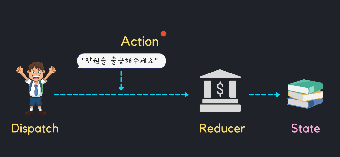 이때 은행은 Reducer라고 할 수 있습니다. Reducer는 state를 업데이트 해주는 역할을 합니다.